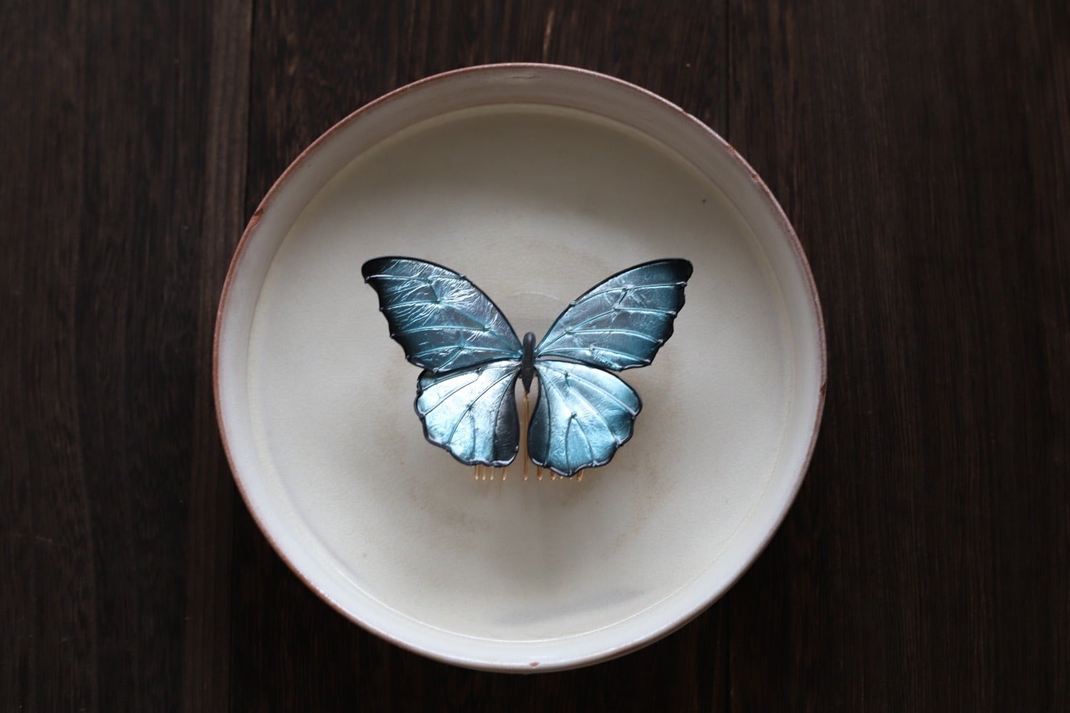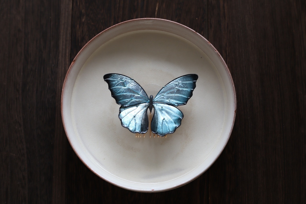 真鍮黒ワイヤーで形作った後に金沢の銀箔で全体に輝きを表現しました。レジンコーティング加工。